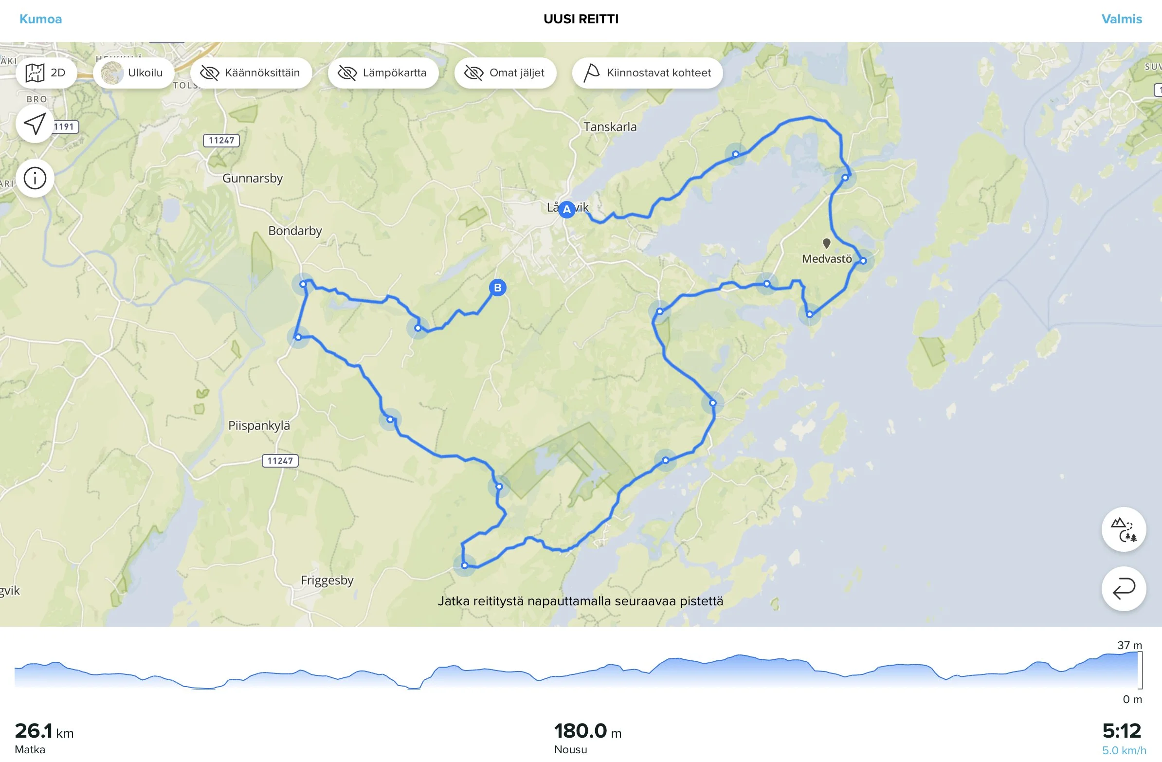 Valmiin reitin voi yleensä tallentaa ja ladata gpx-tiedostona siirrettäväksi toiseen sovellukseen tai laitteeseen.